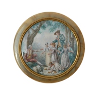 Boîte en corne. Le médaillon du couvercle peint en miniature représente la scène des oublies d'après la gravure de Le Barbier l'Aîné, gravée par AL. Romanet (Suite Moreau le Jeune, édition 1774-82, pour Dialogues et Rêveries) (FM)