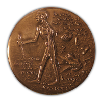 Revers: un personnage nu marchant, de profil à gauche. Il tient un bâton de la main droite; sa perruque, son chapeau et son habit gisent à terre; épars parmi ces objets, des chiffres formant la date 1764 (début de la 1ère rédaction des Confessions); dans la moitié droite de la médaille, derrière le dos du marcheur: Je veux | montrer à | mes semblables | un homme | dans |; à gauche devant les jambes: toute | la vérité | de la | nature,; à droite et sous le personnage: et cet | homme | ce | sera moi.