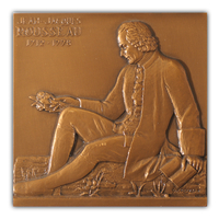Rousseau, profil à g., assis dans la nature, considérant les fleurs qu'il tient à la main droite, un livre dans la gauche.
