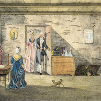 «Intérieur de la Chambre de Rousseau à l'Isle de S.t Pierre. / Il s'évade par une trape afin de se dérober aux visites importunes.»