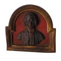 Buste en fonte (ou en bronze) de Rousseau, de face, à mi-corps, vissé dans un cadre doré qu'on imaginerait fait pour une icône et dont la base de forme rectangulaire s'arrondit en demi-cercle au-dessus du buste très légèrement décroché.