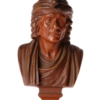 Petit buste sculpté dans un marbre brun ? enchassé dans le vêtement et la perruque en bronze et posé sur un pied carré. Rousseau est de face, coiffé d'un bonnet phrygien sur une perruque roulée jusque sur la nuque et drapé dans une toge. Yeux à la Houdon.