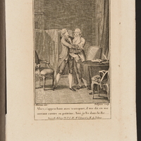 Saint-Preux tient dans ses bras Milord Edouard dans une chambre coupée au fond à gauche par un paravent devant lequel est placé un fauteuil. A droite se trouve une table ronde napée sur laquelle est étalé un nécessaire d'écriture. Près d'elle, une chaise où sont posés une épée et un tricorne.