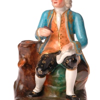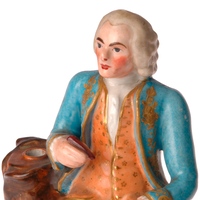 Statuette de Rousseau, exact symétrique de Voltaire. Assis sur une pierre, avec un tronc formant encrier, la jambe droite repliée en arrière, il tient sur son genou gauche un papier qu'il est en train d'écrire. Tête nue, avec une perruque blonde, le visage marqué de noir et de rouge comme Voltaire, son habit est bleu clair, son gilet saumon, sa culotte noire ou bleu très foncé, de même que ses souliers à boucle.