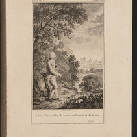 Sur un chemin qui mène vers Paris dont on voit au loin l'île de la Cité et qui passe près d'un moulin à vent, un homme (Jean-Jacques Rousseau), tête nue et le tricorne sous le bras gauche, joint les mains en regardant la ville, debout sous un arbre.