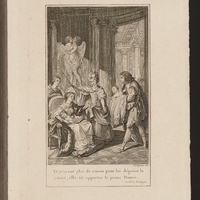 Scène d'intérieur, la reine, à gauche, assise sur un fauteuil, tient un nourrisson sur ses genoux. Elle tend le bras gauche vers un autre enfant que lui apporte un homme. Deux femmes entourent la reine. En arrière-plan, statue de deux anges se baisant la bouche.