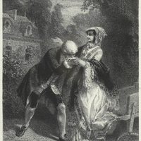 Dans un parc, Mme d'Epinay à droite de profil à gauche, tend sa main à Rousseau qui, tête nue, l'embrasse tendrement en s'inclinant de trois-quarts à droite. A gauche, une maison.