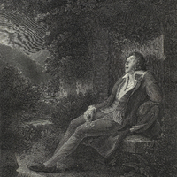 Portrait de Jean-Jacques Rousseau jeune, assoupi sur un banc de pierre.