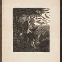 Portrait de Rousseau en pied, tourné de trois-quarts à droite, assis sur un rocher à l'orée d'un bois. Il a posé à sa gauche son chapeau et sa canne; il tient un crayon de la main droite et de la gauche serre contre lui un carnet de notes. Le site domine un pays de collines où l'on voit quelques maisons et bosquets.