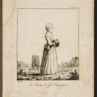 Portrait en pied de profil à droite, portant une coiffe, les mains dans un manchon; à l'arrière-plan à gauche, l'île des Peupliers à Ermenonville avec le (second) tombeau de Rousseau; à droite, le temple de la Philosophie.