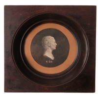 Cadre rectangulaire de bois creusé d'un cercle contenant un buste gravé de Rousseau sur fond noir, profil à droite, nu tête, chevelure au naturel, épaules nues. Au dessous, en blanc, l'inscription Vir.