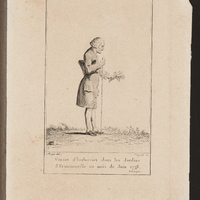 Portrait en pied de J.J. Rousseau, tourné à droite, le tricorne sous le bras et la canne dans la main droite [c'est-à-dire du mauvais côté: voir BAJJR 61], "foin" dans la gauche. Il est de profil, un peu voûté.