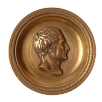 Applique de décoration en laiton pour un meuble de style, de forme ronde, bordure décorée d'une couronne (entrelas); au fond de la cuvette, buste de Rousseau, de profil à droite, nu tête, coiffure à la romaine, maintenu au fond de la cuvette par un rivet.
