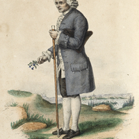 Portrait de J. J. Rousseau inspiré de Mayer, en pied, herborisant, visage tourné à gauche, pervenches à la main droite, s'appuyant de la gauche dur une longue canne, tricorne sous le bras. Fond: désert.