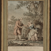 Rousseau, tête nue, en perruque, est en habit de ville; tourné de profil droit, il offre sa bourse de la main gauche à une femme suppliante. A l'arrière-plan, un âne en train de brouter.