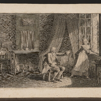 L'estampe montre Rousseau étendant le bras et Thérèse ouvrant la fenêtre d'une chambre où brûle un feu de bois dans une cheminée surmontée d'une glace avec un trumeau représentant un paysage. Sur le clavecin, la partition du Devin du Village. Chaises et tabouret de paille. Divers objets d'usage courant: table, théière. cafetière, tasse, flambeau, canne et un lit à baldaquin.