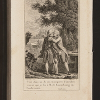 Dans un parc, Jean-Jacques Rousseau embrasse le maréchal de Luxembourg en le serrant entre ses bras. Rousseau est tourné de trois-quarts sur sa droite, le maréchal est de dos, la tête tournée sur sa droite.