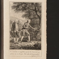 Paysage de campagne, arbres et montagne. DuPeyrou et Jean-Jacques Rousseau se promènent, ce dernier représenté de profil droit, debout, légèrement incliné en avant, tend son bras gauche vers une fleur, tandis qu'il tient sa canne de sa [main droite].