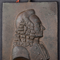 Plaque de bronze patiné à suspendre, au centre de laquelle se trouve le buste de Voltaire, profil à droite, tête nue, en perruque. La plaque et le bas-relief forment un tout.