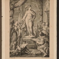 Galatée debout sur son piédestal, entourée d'admirateurs et d'artistes la prenant pour modèle.
