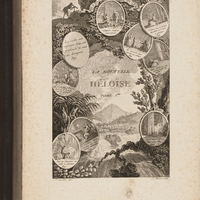 Un paysage de torrents et de montagnes s'ouvre sous une arche de pierre sur laquelle un personnage travaille au télescope. 9 médaillons ovales représentent des scènes de La Nouvelle Héloïse.