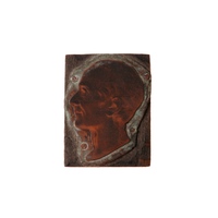 Bloc de bois sur lequel est clouée une plaque de cuivre gravée qui montre le buste de Rousseau de profil à gauche, tête nue, coiffure à la romaine.