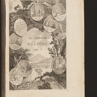 Un paysage de torrents et de montagnes s'ouvre sous une arche de pierre sur laquelle un personnage travaille au télescope. 9 médaillons ovales représentent des scènes de La Nouvelle Héloïse.