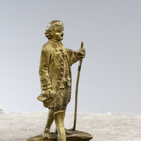 Porte-montre à gousset. Jean-Jacques Rousseau en pied, debout, de ' à droite, tenant sa canne de la main gauche et son chapeau sous le bras gauche; la main droite porte une liasse de papiers et des papiers débordent de la poche de droite (d'après le Rousseau du sculpteur Suzanne «dans l'attitude de marcher»). Le crochet pour suspendre la montre est fixé sur le sol.