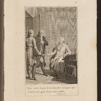 Un homme, assis de face dans un fauteuil, le bras gauche appuyé à son écritoire posée sur une table,le bras droit tendu vers deux hommes debout qui entrent par une porte située à gauche de la vignette; ils sont tête nue, celui de l'extrême gauche tenant son chapeau de la main droite.
