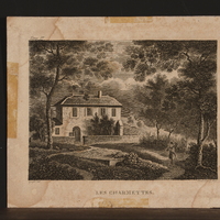 La maison des Charmettes, presque de face, entourée d'arbres, sous un ciel nuageux. Au centre, au premier plan, un soupirail. Sur le sentier, à droite, un homme lisant, canne à la main, coiffé d'un haut-de-forme.