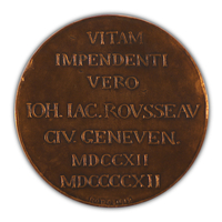 Avers: la tête de Rousseau occupe tout le champ, profil à g., coiffure à la romaine, couronne tenant la chevelure; derrière à dr., une pervenche.