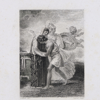 Un homme réconforté par une femme, tandis qu'à l'arrière un guerrier casqué, armé d'une lance et d'un bouclier repousse un cupidon.
