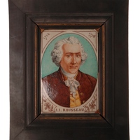 Portrait peint sur faïence entouré d'un large cadre en bois noir. Rousseau est représenté de trois-quarts à droite, arborant un habit à la française à 3 boutons de couleur brune, un gilet jaune, un jabot de dentelle, et portant perruque.
