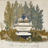 Broderie à claire-voie représentant de manière fantaisiste le tombeau de Rousseau sur l'Ile des Peupliers à Ermenonville; au premier plan, quelques plantes fleuries, à droite un mouton. Sur le monument, des branches et une urne.