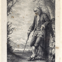 «réduction d'une grande pièce représentant une scène de l'"Emile": comment retrouver son chemin ' Montmorency» (FM), connue sous le titre «Le Méridien», ici Rousseau seul, Emile supprimé et paysage plutôt lémanique.
