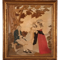 Technique: les visages et les mains ont été dessinés, le tronc du grand arbre, le banc de pierre, le sol, les vêtements sont faits de fil de soie. Ces pièces sont brodées sur un tissu, les feuillages sont en chenille.