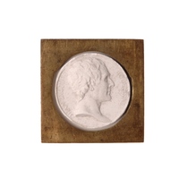 Plaque de cuivre, percée d'un cercle dans lequel a été fixée une médaille de plâtre uniface, dim. 41,6, le carré : 56,8. Buste de profil à droite, tête nue, à la romaine.