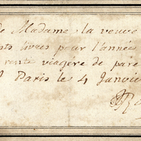 Reçu de Rousseau en 1777 de sa rente viagère de 300 £ versé par la Vve Duchesne pour le Dictionnaire de Musique terminé à Môtiers en 1764 et imprimé à Paris en 1767 (mais daté de 1768)