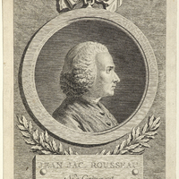 Portrait de J. J. Rousseau «représenté de profil à droite dans un médaillon rond. Il est nu-tête, il porte perruque frisée. Son habit fermé laisse seulement dépasser le col de toile. Le médaillon est suspendu par une boucle à un nœud de ruban, accroché à uin cdre gravé, limité par un trait carré. Au-desous du médaillon, un cartouche, fixé par deux clous sur deux branches de laurier entre-croisées, porte la mention [']» (FM)