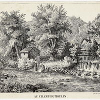 Dans un environnement d'arbres, trois maisons au bord de l'eau où travaillent trois lavandières.