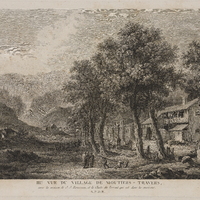 «III.E VUE DU VILLAGE DE MOUTIERS ' TRAVERS, / avec la maison de J. J. Rousseau, et la Chute du Torrent qui est dans les environs. / A.P.D.R.» ["Tableaux de la Suisse", Laborde et Zurlauben, Paris, 1780] «No 84.»