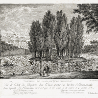 «TOMBEAU DE JEAN JACQUES ROUSSEAU» (en lettres blanches) / «Vue de l'Isle des Peupliers, dite l'Elisée, partie des Jardins d'Ermenonville, / dans laquelle J.J. Rousseau, mort à l'age de 66 ans, a été enterré le 4. Juillet 1778.» «Entre ces