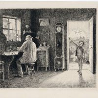 Vue imaginaire de Rousseau saluant son père à l'atelier. La porte ouverte laisse apercevoir la cathédrale Saint-Pierre