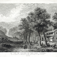 «III.E VUE DU VILLAGE DE MOUTIERS ' TRAVERS, / avec la maison de J. J. Rousseau, et la Chute du Torrent qui est dans les environs. / A.P.D.R.» ["Tableaux de la Suisse", Laborde et Zurlauben, Paris, 1780, No 84]