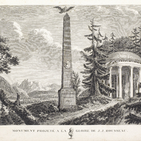 «MONUMENT PROJETÉ A LA [ ] GLOIRE DE J.J. ROUSSEAU.» Au milieu de l'inscription est gravé un petit buste, de profil tourné à droite, d'après celui de Houdon.
