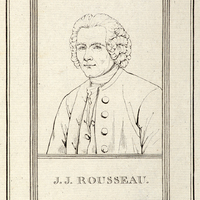 Portrait de J. J. Rousseau en habit à la française, buste à mi-corps, visage tourné à gauche, entouré d'un quadruple trait carré de 9,3 x 5,9.