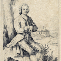 Portrait de J. J. Rousseau «représenté en pied, assis sous un arbre au bord d'un chemin. Il est nu-tête, et porte l'habit de Rousseau herborisant. Il a croisé les mains sur sa canne qu'il tient entre ses jambes; dans la main droite, quelques fleurs qu'il a cueillies. Son tricorneest posé à terre sur un livre.