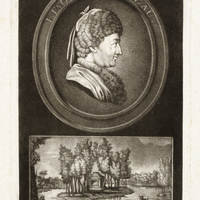 Rousseau de profil à droite en costume arménien, dans un médaillon ovale. Au-dessous, un paysage de forme rectangulaire représentant l'île des Peupliers. Au premier plan, sur la rive, une femme à genoux à côté de son chien, à droite deux vaches dont l'une est couchée.