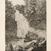 «LE SAUT DU DOUX.» [Doubs] «Cascade d'environ 80 pieds de hauteur, près le Village des Brenets, sur la Riviere du Doux,/ Limites de la Principauté de Neufchâtel en Suisse et de la Franche-Comté.» «Se vend à Paris chez B. A. Nicollet, Graveu