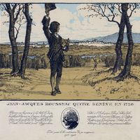 «JEAN-JACQUES ROUSSEAU QUITTE GENÈVE EN 1728» (en lettres grises) ['] «Edité pour le bi-centenaire de sa naissance. / 1712-1912»